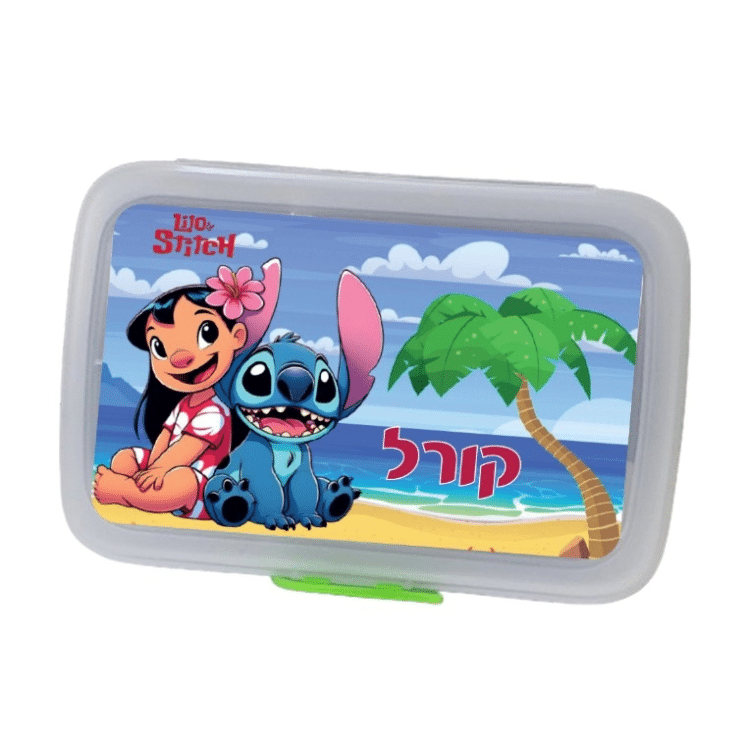 הפתיעו את הילדים עם קופסת אוכל מעוצבת אישית בכיכובן של הדמויות האהובות לילו וסטיץ'! הקופסה כוללת רקע צבעוני של חוף טרופי עם איור מקסים, ועליה שם הילד/ה במיתוג אישי – לשימוש יומיומי עם טאץ'