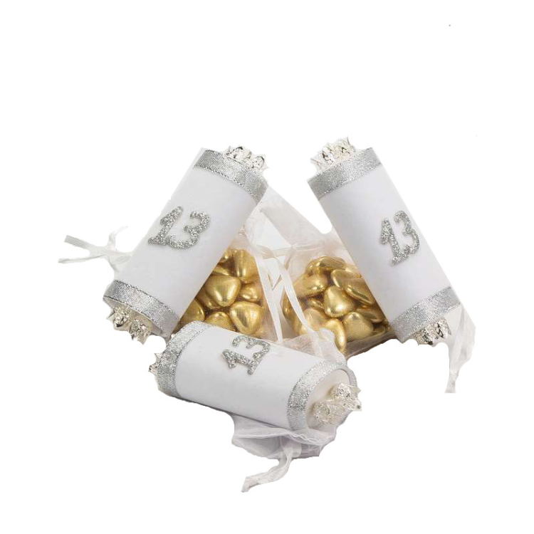 שקית אורגנזה אלגנטית הכוללת ספר תורה דקורטיבי עם הספרה 13, בעיצוב לבן־כסף יוקרתי.