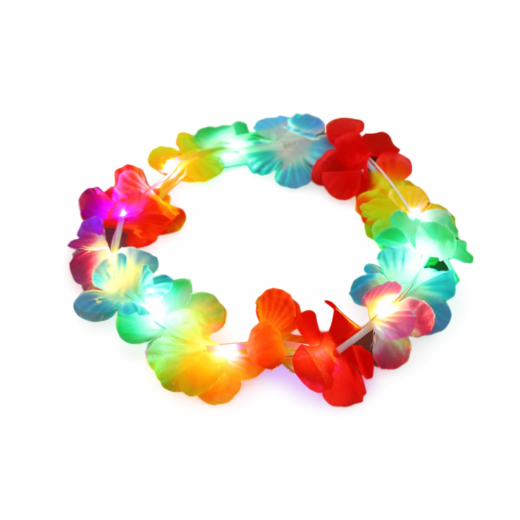 שרשרת הוואי עם פרחים צבעוניים ואורות LED זוהרים יוצרת מראה מרהיב במיוחד בחושך – מושלמת למסיבות ניאון, ימי הולדת, מסיבות בריכה, ערבי קיץ ועוד.