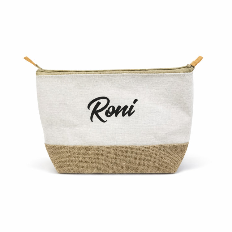 נרתיק איפור מעוצב ואיכותי, משולב בד בד וג’וט טבעי, עם אפשרות להדפסת שם בהתאמה אישית. מושלם , לנסיעות, לאיפור בבית ועוד
